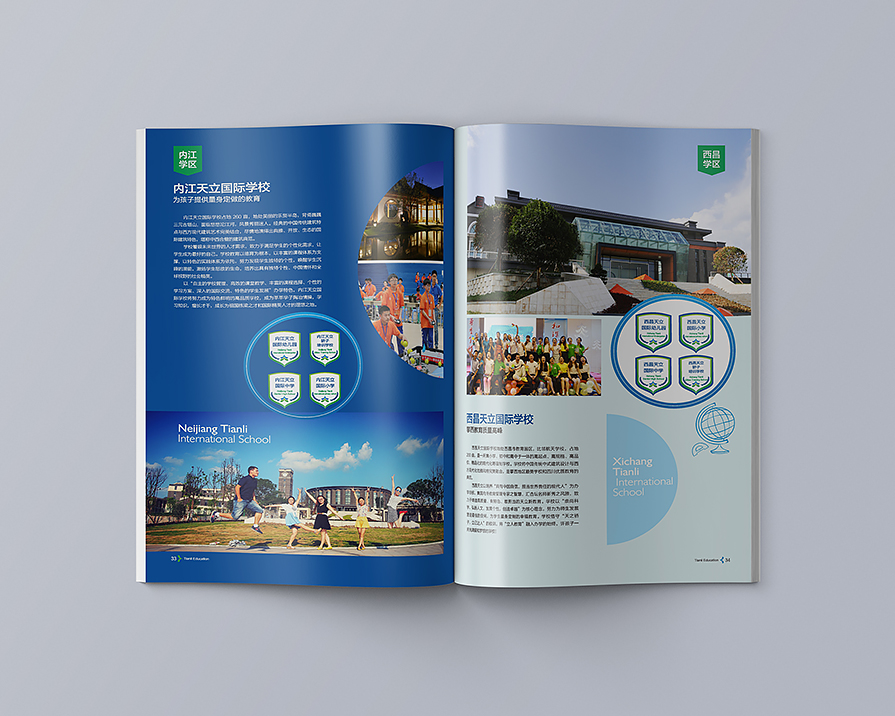神州天立教育集团隶属于神州天立集团,创办于2002年,总部位于四川成都,已成为涵盖学前教育、小学教育、初中教育、高中教育的全国知名教育集团。本案中延用其logo中的蓝色为主色调,以简单清晰的形式呈现天立教育集团庄重、活力。